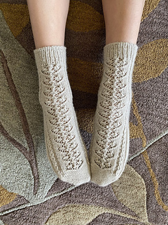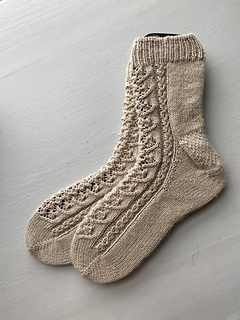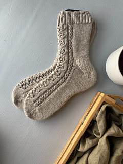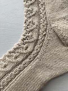 The Cressid Socks are knitted with fingering weight yarn on 2.25mm needles (US 1). This pattern is written as a toe-up sock with a split gusset, an Eye of Partridge heel flap, lace paneling, and a 1x1 rib with a tubular bind-off.