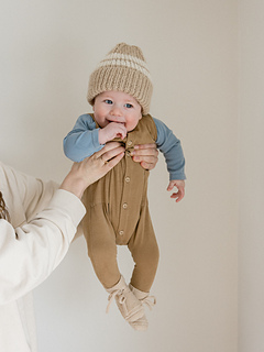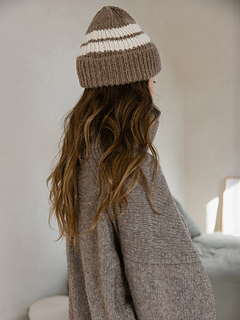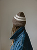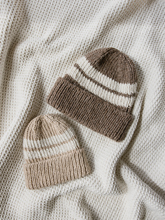 The samples shown are both made in Cascade Baby Alpaca Chunky. The larger beanie (size 6) is knit in colors 669 Walnut Heather and 565 Ecru. The smaller beanie (size 1) is knit in colors 602 Linen and 565.
