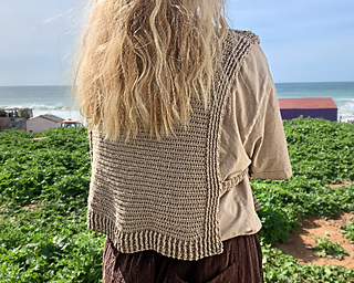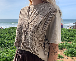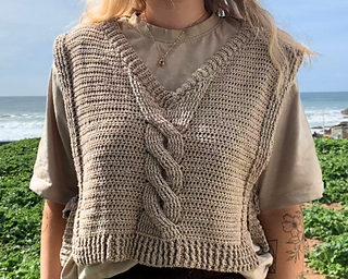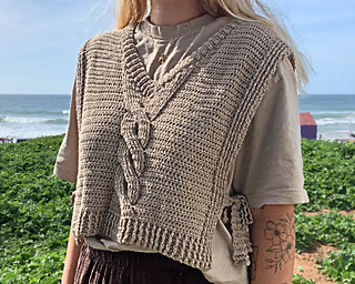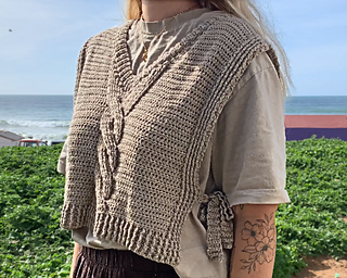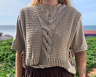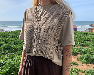 This crochet vest pattern features a structured cable panel, side ties, flattering V-neck shaping and instructions for custom sizing so you can adjust it to your own measurements.
