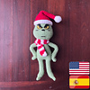A small amigurumi Grinch-style doll wearing a Santa hat and scarf — perfect as a Christmas ornament, home decoration, or handmade gift.
