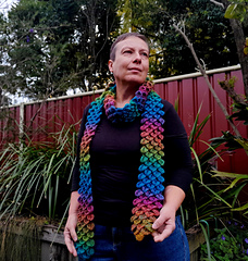 The scarf used 160g of yarn which is slightly more than one ball of the 150g balls of Panda Crypto. The pattern uses 2 balls of yarn. The best method of construction is to work one ball to the middle of the scarf, and then to start a fresh ball from the end to the meet in the middle. I ended up with a centre join, where 2 rows of three crocodile stitches are aligned and mattress stitched together. In this way you can adjust the length of the scarf from both sides, and also and have lovely scaly point on each end.