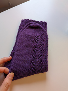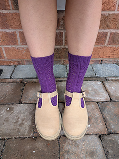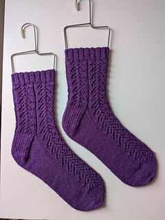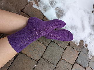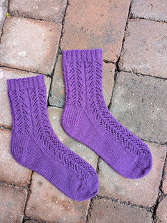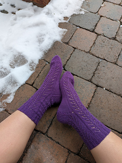 The Crocus sock is knit from the top down and uses yarnover, ssk, and k2tog to create a branch-like lace pattern on the leg and top-of-foot portion of the sock. First, a ribbed cuff is knit, flowing seamlessly into the lace leg portion. A classic heel flap and gusset is worked, while preserving the continuity of the lace pattern at the top of the foot. The foot portion is worked in stockinette for the bottom of the foot and lace pattern for the top of the foot. Finally, toe decreases are worked, and grafted together using the Kitchener stitch.