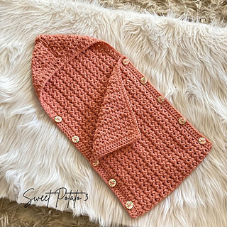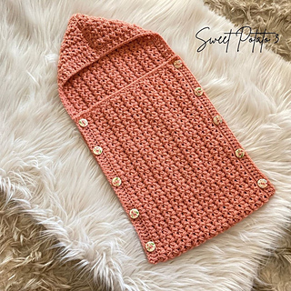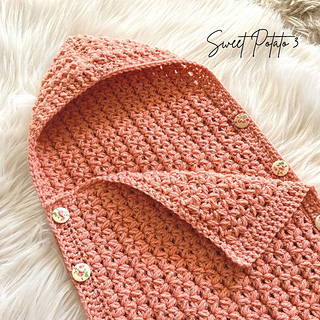 The hooded cocoon is easier to lay a sleeping baby into for photos then just fold up and button close, much easier than a tight cocoon. The Cocoon buttons on both sides to allow for easy placement in and/or out. This cocoon is made as one piece and the pattern includes sizes 0-3 month, 3-6 month, and 6-12 month.