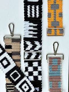 Change up your purse strap with this tapestry crochet version. Tapestry crochet uses the common stitches. The technique results in a tight, reversible fabric perfect for this project. The pattern provides multiple design choice. Pick one or mash several together for a look all your own. Designs use 2 or 3 colors. Straps are approximately 2” wide and, alternatively, can be used as a guitar strap, cell phone strap or a belt.