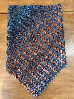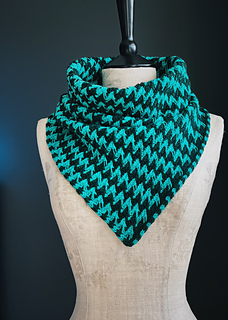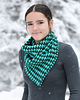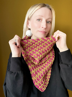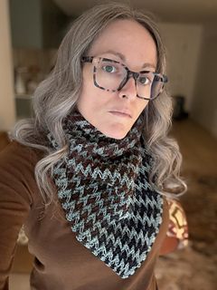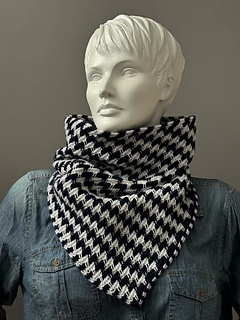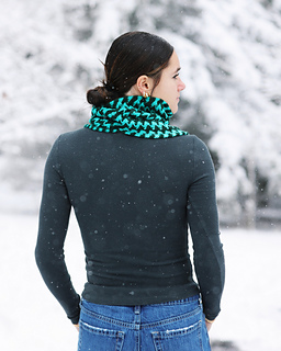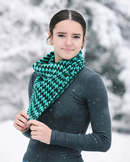 Knit flat on the bias, Crosscurrent begins at the top left corner and grows through carefully placed increases and decreases. Worked with two contrasting shades of sport weight yarn, the mosaic-style colorwork is intuitive, engaging, and a joy to knit – worked one color per row. After blocking, the cowl is seamed using mattress stitch for a smooth, nearly invisible finish.