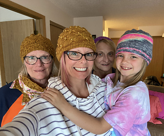 The hat is knitted in the round on size US5 16-inch circular needles. It is a written pattern that includes 5 sizes: toddler, child, teen, adult, and adult large. The gauge is 6 stitches per inch.