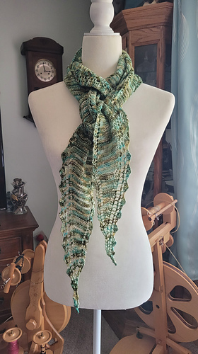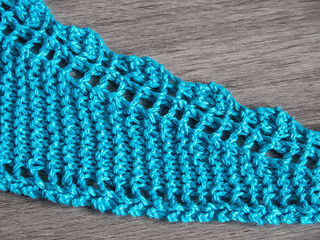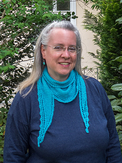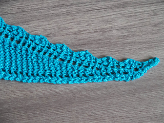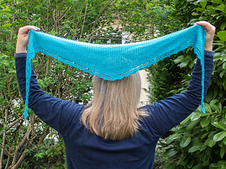 The turquoise sample shawlette measures 142 cm / 56” in length and 23 cm / 9” at the widest point and used one ball of Natural Knits Summer Cashmere by Lana Grossa, 210 meters / 230 yards.
