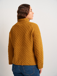The back and front are then joined at the bottom of the armholes, and the body is worked in the round in the cable pattern until it is divided into front and back again. Each section is then worked flat to form the side slits. Stitches are picked up along the armhole openings, and the sleeves are worked in the round in the cable pattern down to a 1 x 1 Rib cuff. Finally, stitches are picked up for the 1 x 1 Rib collar.