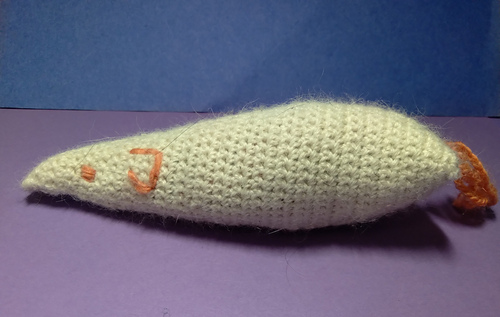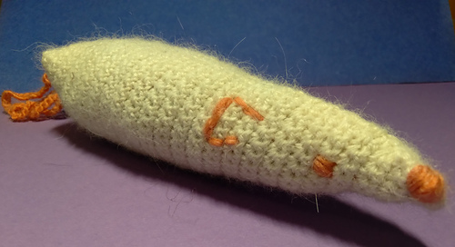 Make this catnip kicker toy for your favorite kitty! This kicker toy is stuffed with catnip, and old socks, plastic, or any of your cat’s favorite things. It is about 6.5” long minus the optional tail. The size can be adjusted easily by sizing up the crochet hook, or yarn size if you want it much bigger.