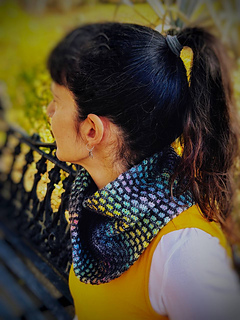 The cowl shown in the cover is a fingering weight version, size adult S, and it measures 27 ½ inches circumference and 8 inches height.