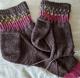 The pattern is written as an ankle sock, however can be extended by working more rounds between the candles detail and the heel turn.