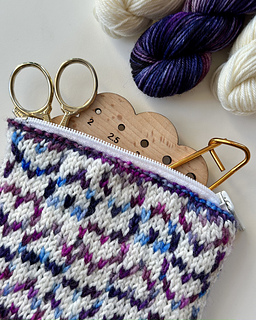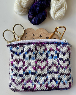 The Cupid Clutch is a small and decorative zippered pouch with a Valentine’s inspired colorwork motif. Perfect for holding small items like stitch markers, coins, or earbuds, it makes an ideal gift or personal treat. The clutch is knitted in the round and sewn together with a zipper. The clutch in the photo has been knitted in size 1 in Merino Sock from Sabinas Farver in Terrific Twos and natural.