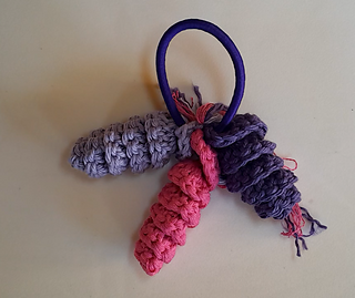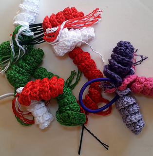 It is ideal for leftover pieces of yarn (I used less than 10g per curly cue). You can decorate any hair accessories that you have on hand, I have shown it used with hair elastic, bobby pins and snap clips.