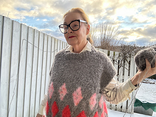 The decorative motif is knitted in two strands of Bella (solid) and Bella Color (variegated) following a chart.