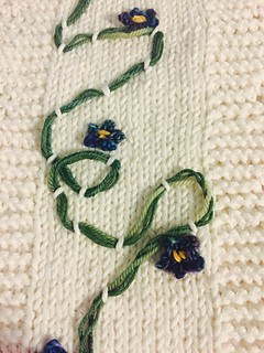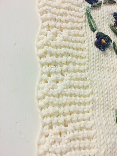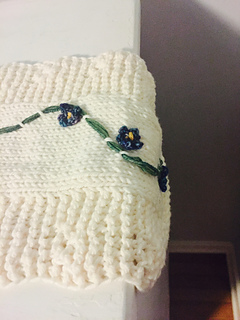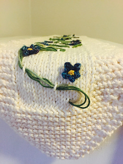The gently scalloped edge compliments the curls of the flowers, while the straight edge of the stockinette centre finishes neatly with 90 degree angles.