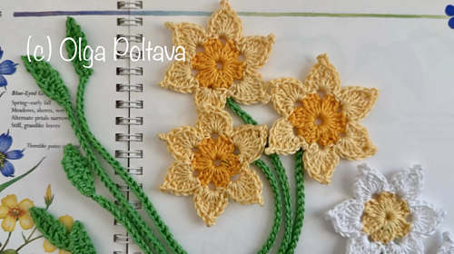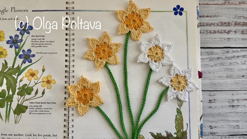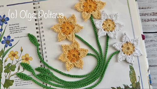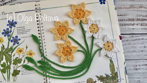 You can also use this little daffodil flowers in many ways—as a bookmark, of course, but also to decorate gift packages, tuck into cards, embellish sachets or linen bags, or as an appliqué on pillows or other projects. It’s a versatile and fun piece to crochet, with lots of possibilities.