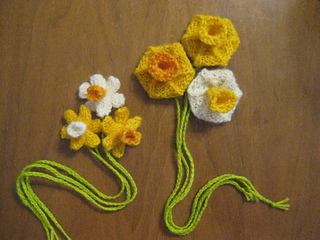 The larger daffodil bookmarks are knit in the round on dpns, starting at the petals outward edge with pretty decreases to the center then simple knitting upward for the cup. The mini daffodil bookmarks consist of 3 i-cords, that are crisscrossed into position and then sewn in place. The cup is made by picking up stitches and knitting in the round.