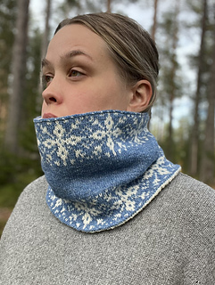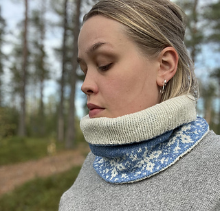 The Daga Cowl is cast on using a provisional cast-on and worked in the round using circular needles. It begins with 1x1 ribbing, followed by stranded colorwork. After that, the work is joined to form a seamless tube, and the final edge is bound off using a three‑needle bind‑off. This means it can be worn with either side facing out, or folded down to show both sides at once.