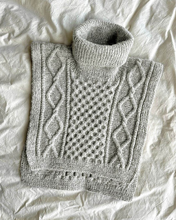Dagmar Neck is worked in texture and cable patterns up the back, up and over the shoulders, and down across the front. An opening for the head is worked, where stitches are picked up and knitted along for the turtleneck collar.