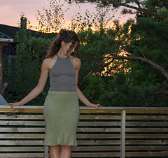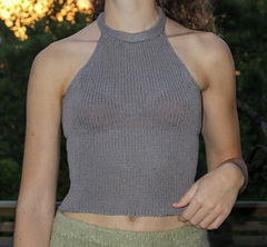 An elegant and figure-hugging top featuring a halterneck and an open back. The top is knit from the bottom up, with i-cord edging along the back for a neat finish. A long, double-knit ribbon is sewn to the front, tying behind the neck to create an elegant bow that drapes down the back. The top has plenty of negative ease, making it perfect for warm days and evenings.