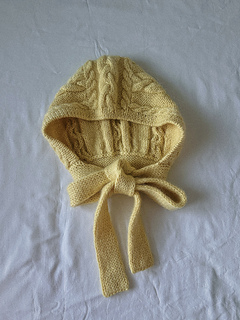 The Daisy Bonnet is closely fitted bonnet worked top-down. Begin by knitting a square for the crown, working back and forth following the cable chart. Then pick up stitches along both sides of the square and continue working flat using the second cable chart. After that, knit the ribbed edge along the face opening. Finally, work the double-knitted band and join it to the neckline of the bonnet.