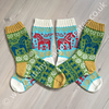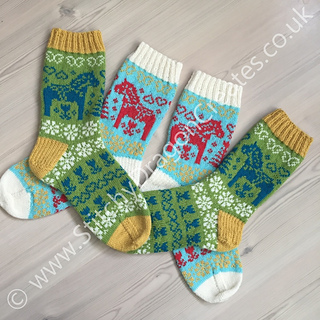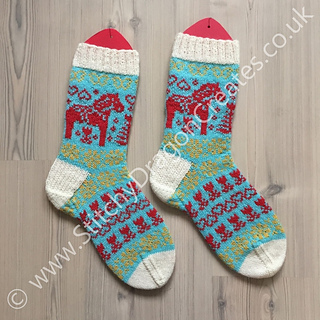 The Dala horse (or Dalahäst in Swedish) is a traditional carved and painted wooden horse that has become a symbol of Sweden and of Swedish handcrafts. The man credited with introducing the painting technique still used today also emigrated to the American Midwest around the same time as my Scandinavian ancestor. I designed these socks during the first Covid lockdown with the hope that knitting them would remind people of the wide world that was still out there for us to explore in the future.