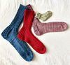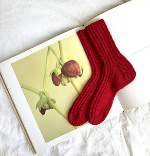 These socks are worked top-down in the round, beginning with a 2×2 ribbed leg for stretch and comfort. The heel flap is worked flat, continuing the ribbing as a decorative detail, and is shaped with short rows to turn the heel.