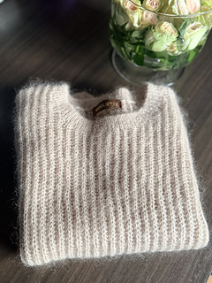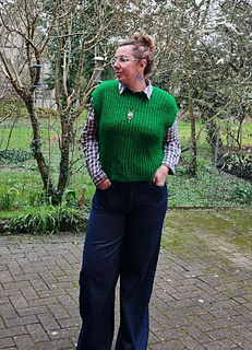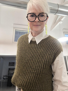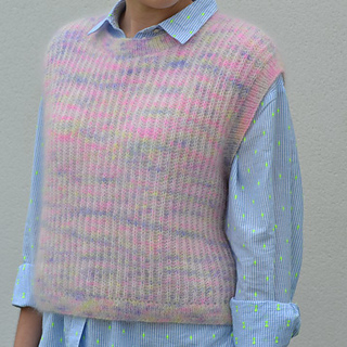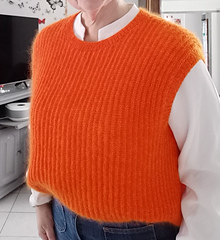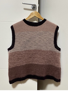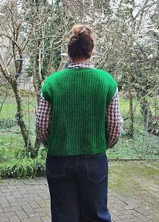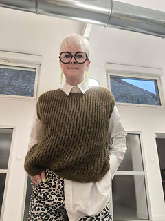 The garment is worked flat in two pieces from the bottom up, then seamed. Stitches are picked up afterwards around the armholes and neckline to knit the ribbed edges. The seams provide structure and help the garment maintain its shape over time.