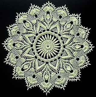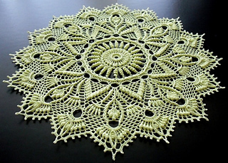 Your tension will determine things like hook size, yardage, finished size, and height of stitches. Using recommended thread and hook this pattern will use approximately 328 - 364 yards of thread. And your finished doily will be about 32 cm /13’’ in diameter from point to point.