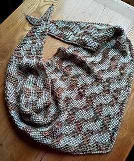 Dauerwelle (the German name means continuous wave, but also stands for a perm) is a small shawl with a continuous mosaic pattern, worked from side to side. The size of the elongated triangle is variable and can be adapted to individual wishes or the amount of yarn available.