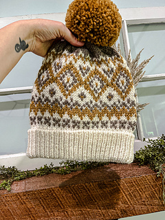 The Days of Wonder Beanie was designed in collaboration with Originally Lovely for their Adventures in Life Collection, published in the Fall of 2024. It is a 3-color, stranded colorwork beanie featuring a stay-in-place folded brim, with a moderately slouchy fit. This design was inspired by the classic Norwegian, Fair Isle style of knitting. Fair Isle is timeless and loved throughout the generations. Geometric shapes, vintage, and earthy tones also inspired this design.