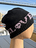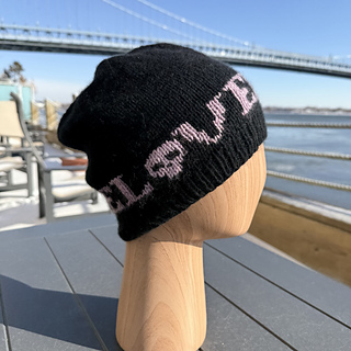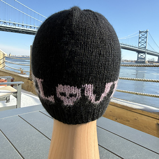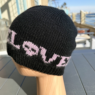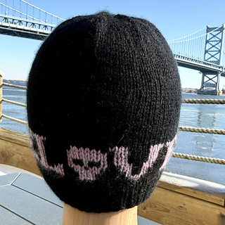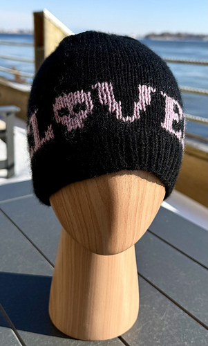 Dead Love is a DK-weight stranded colorwork hat featuring a graphic word motif (Love) paired with a small skull motif. The hat is worked from the brim up with 1×1 ribbing, followed by stranded colorwork and a smooth, shaped crown. Note: The chart shown is for the repeating “LOVE” with a skull motif only.