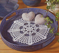 White octagonal doily. Shown in blue basket with two heart-shaped concrete rocks and ivy.