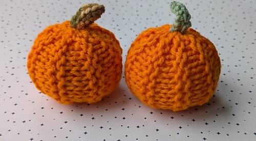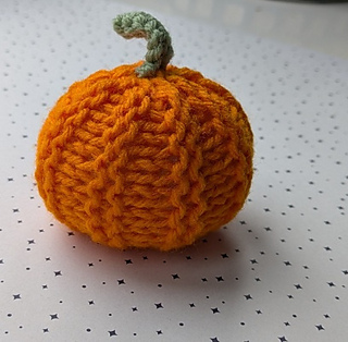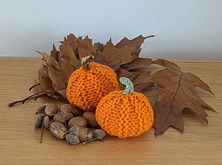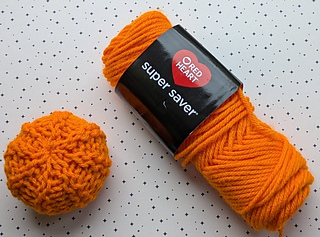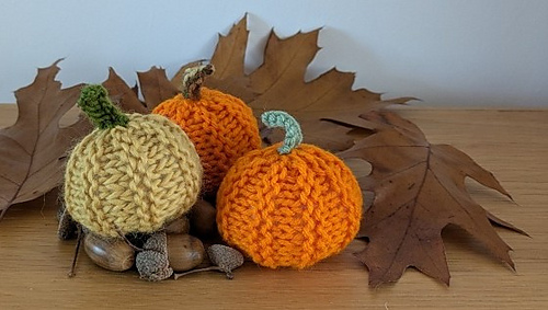 Made using Red Heart Super Saver Yarn which is Aran weight (worsted weight, medium) and 4.5mm needles. Yellow pumpkin completed using chunky yarn on 5mm needles. Uses a small amount of stash yarn.