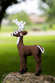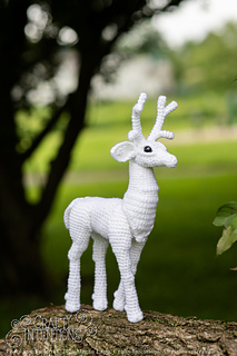 This pattern comes with instructions to make Deer! This pattern includes instructions for a Body, straight/standing front leg, extended/stepping front leg, Straight Standing Rear Leg, Extended/stepping rear leg, a head with or without colorwork, eyelids, a tail, ears, three styles of antlers, and 2 styles of chest/neck fur. This pattern features clear step by step instruction with a lot of row-by-row photos. The gauge is not crucial to the pattern as long as the stitches are tight enough to hold stuffing.