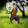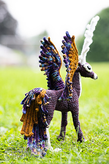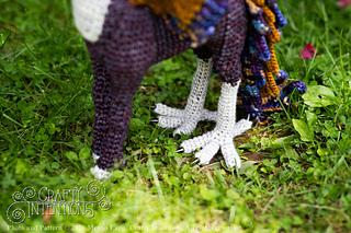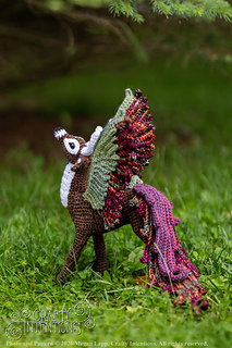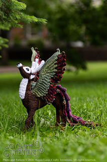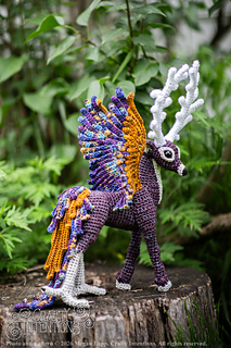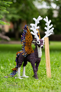 This pattern comes with instructions to make a Peryton! This pattern includes instructions for a Peryton Rear Legs, 11-point antlers, Wings, a feathered tail, and an assembly. This pattern features clear step by step instruction with a lot of row-by-row photos. The gauge is not crucial to the pattern as long as the stitches are tight enough to hold stuffing.