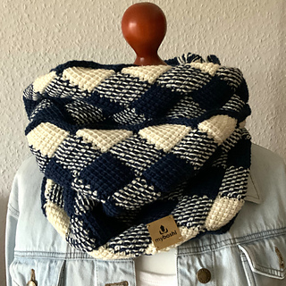 „Delaine“ ist ein Loop, im maritimen Stil, der im Entrelac-Muster in tunesischer Häkelei gearbeitet wird. Man benötigt nur den tunesischen Grundstich und den 2-farbigen tunesischen Grundstich. Er hat eine Größe von ca. 25 cm (breit) x 176 cm (lang, Umfang). Der Loop wird in Runden gearbeitet, das heißt es werden kleine Rechtecke gearbeitet, die dann eine Runde ergeben. Die Wellen-Ränder entstehen von alleine durch die verwendete Technik und werden durch die I-Cord-Anschlagreihe und Abschlussreihe noch betont. Die Grundlagen des tunesischen Häkeln und des Entrelac-Häkelns sollten bekannt sein. Die Anleitung beschreibt das Herstellen des Loops. Eine detaillierte Beschreibung des tun. Entrelac-Häkelns ist nicht enthalten!. Das verwendete Garn “50/50” von myboshi ist eine Mischung aus Baum- und Merino und der Loop somit für alle Jahreszeiten geeignet.