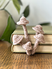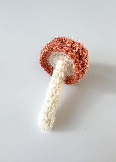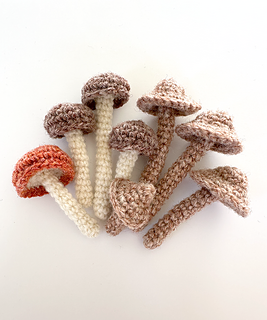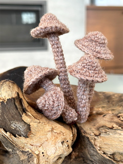 Each mushroom is worked as a stuffed amigurumi piece, use wire to prop them in home decor next to a book. The thin stem gives the finished mushrooms a delicate, elegant look that photographs beautifully against natural textures.