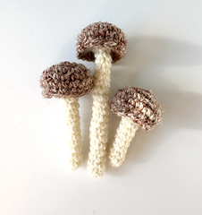 These are the more whimsical, storybook version of a forest mushroom, where the first KnotTerrain mushroom pattern gives you four sturdy chunky silhouettes, these thin-stemmed designs have a lighter, more magical quality that suits fairytale and cottagecore interiors beautifully. Mix and match both patterns for a full forest scene.