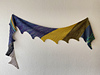 This shawl or scarf is 82”/2.08m long. The smallest triangle is about 3.5”/9cm deep, and the biggest on the sample is 12”/30cm deep.