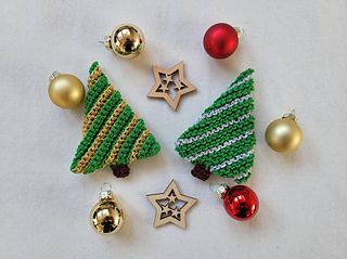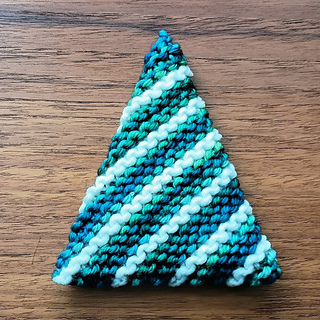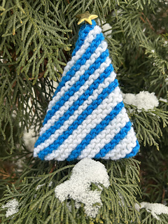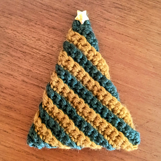 This sweet little Christmas tree uses simple knit (or single crochet) stitches to make a square that is then folded and stitched in place to create diagonal stripes on the trees.