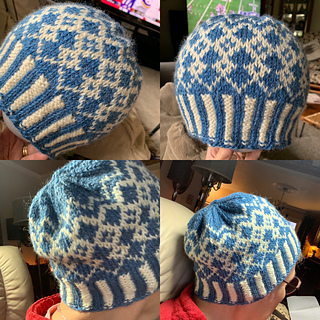This is a worsted weight yarn knit in the round for a one piece hat using stranded colour work for adult sm, med & lg. There are recommended yarns here, but any worsted wool/blend should work. Remember to carry strands across the back fairly loosely to keep from making hat too tight.