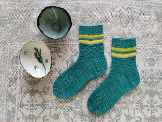These socks are about the joy of community, of friendship and of all the allies that we have in our lives, helping us to keep moving and to keep shining. They feature a simple diamond lattice across the body of the foot and moss stitch diamonds are present in the coloured stripes, which were worked in vibrant neon colours to allude to bright, shining light.