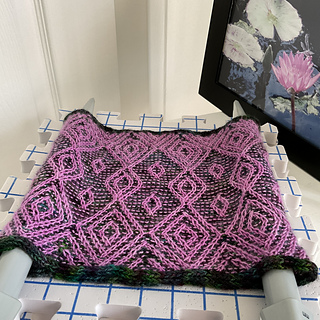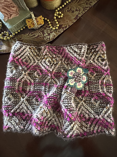 In this intricate cowl the golden yarn weaves delicate, symmetrical patterns over a dark neutral background, reminiscent of golden hour light filtering through a forest canopy. Each motif is framed by bold geometric shapes that evoke both elegance and structure, while the garter stitch base adds texture and depth.