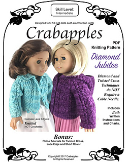 The pattern includes written instructions as well as charts. Whether you choose sweet or sporty, “Diamond Jubilee” is sure to become one of your doll’s favorite cardigans.