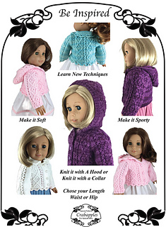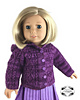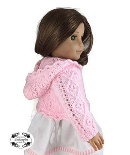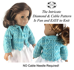 Designed to fit the American Girl® and other 18” dolls, this feminine cardigan can be sweet or sporty. It is knit from the bottom up and there are NO side seams. The cardigan features a diamond design edged with a twisted cable (that does NOT require a cable needle) on the front, back and sleeves. The sweater closes in front with buttons set into a knitted band.