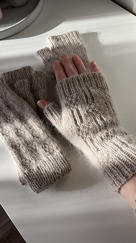 The beige pair is knit in Drops Nord in color 07 held together with Drops Kid-Silk in color 56