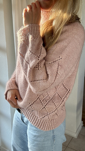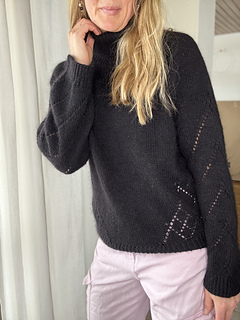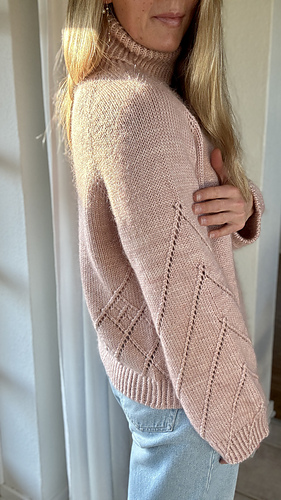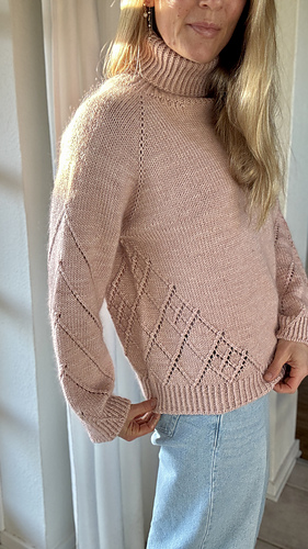 Diamond Line Sweater roll neck is a feminine sweater with a roll neck and a beautiful diamond pattern running along the sides of the body and at the back of the neck, with diamond pattern lines continuing down the sleeves. The sweater is worked top-down, allowing you to adjust both sleeve and body length as described in the pattern. The feminine raglan increases add a delicate detail, while the roll neck gives a timeless and sophisticated look. The sweater is designed with a positive ease of 12–17 cm (4.7–6.7 in).