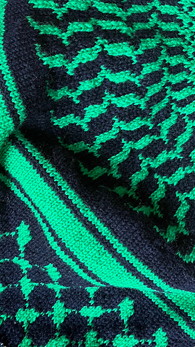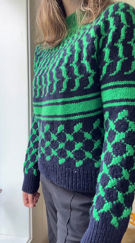 Dignity Yoke Sweater er en ullgenser i tofarget mønster med bærestykke, tegnet etter det tradisjonelle keffiyeh, et arabisk sjal som gjennom snart et århundre har vært symbol for den palestinske frigjøringskampen.