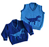 The knitting pattern has instructions for a Sweater and a sleeveless Tank Top featuring a Dinosaur (Velociraptor) on the front.
